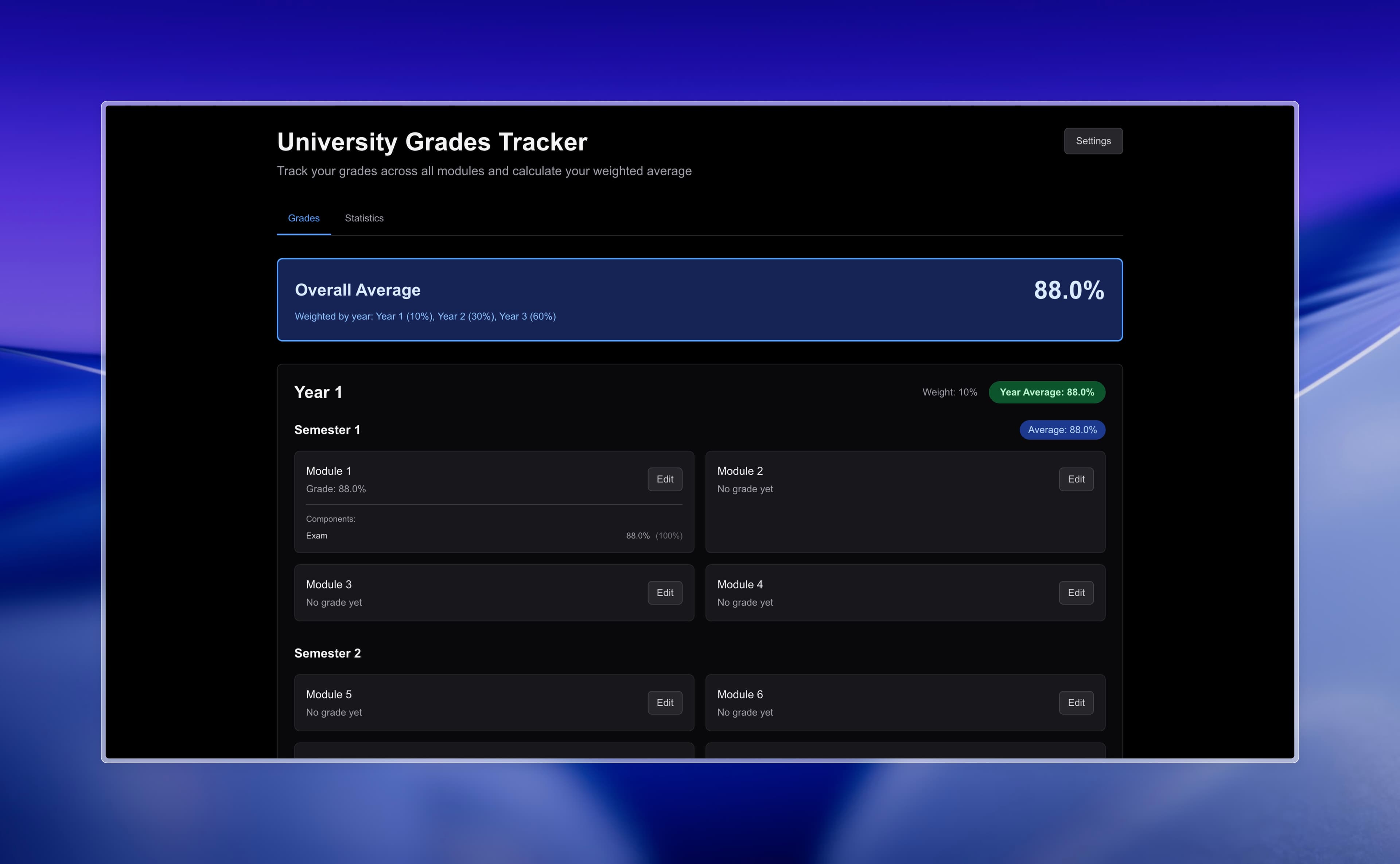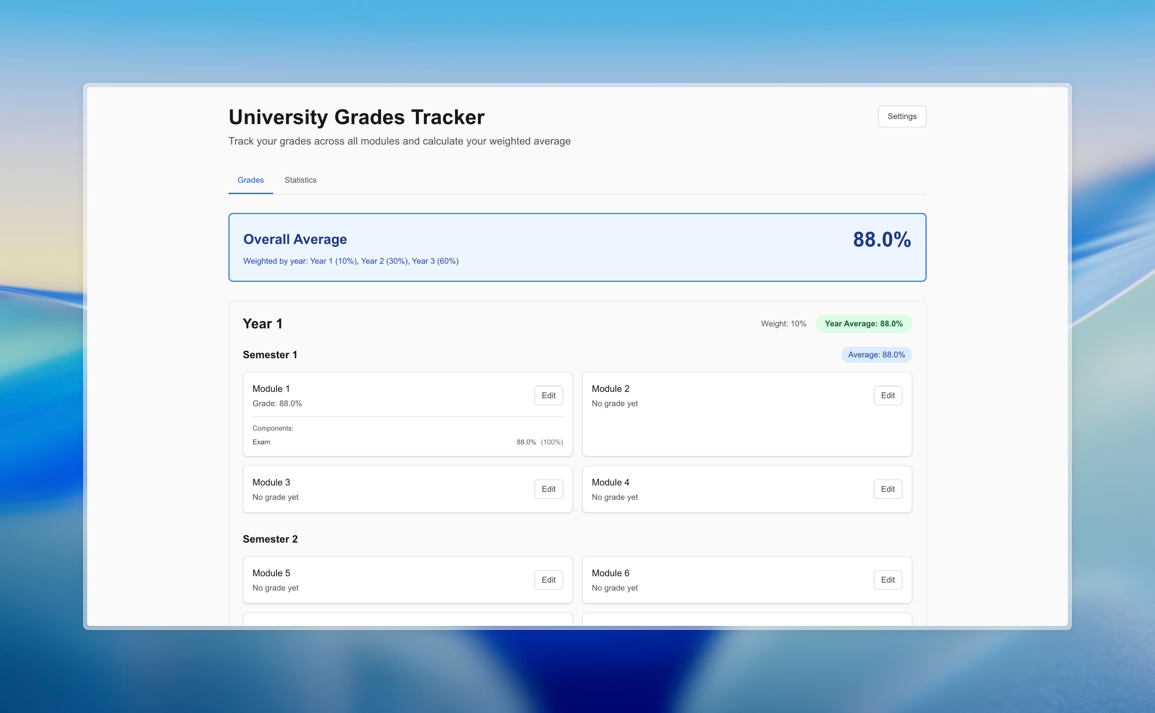 A web application for tracking university grades across different modules and calculating weighted averages. Features include semester and year breakdowns, module grade tracking, and comprehensive statistics.