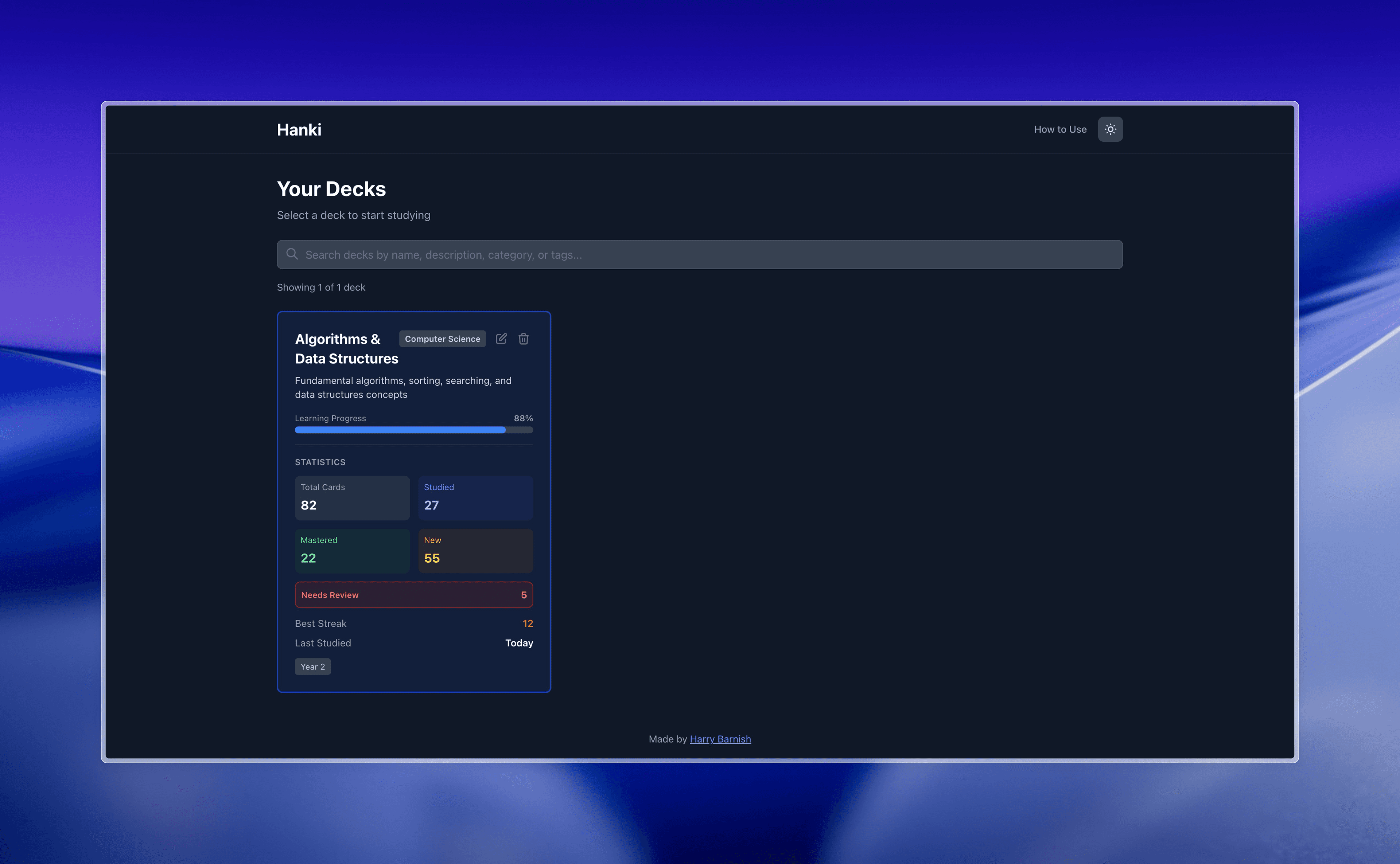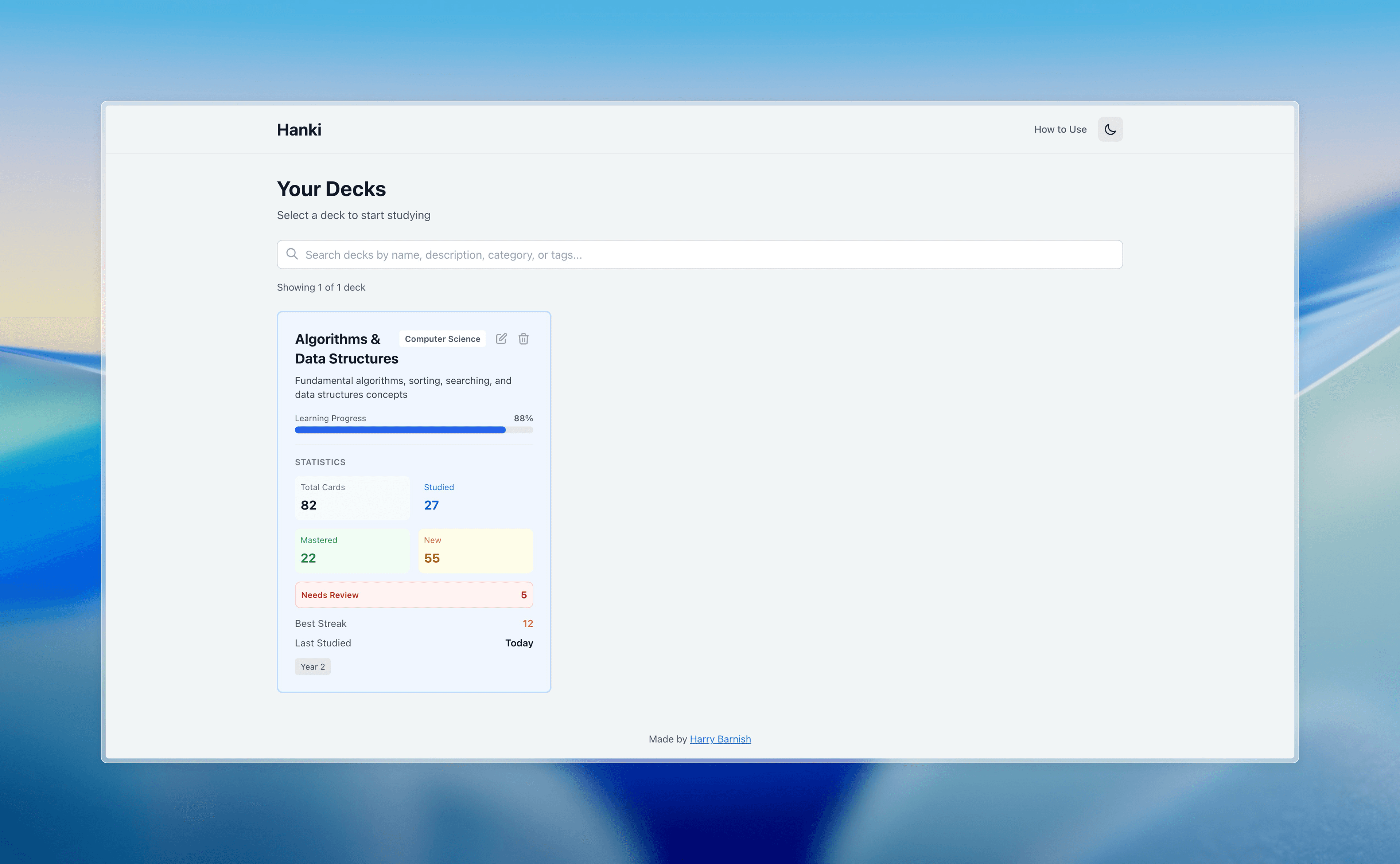 A spaced repetition flashcard application built with Next.js. Study your flashcards with an intelligent algorithm that shows you difficult cards more often and easy cards less often. Features multiple decks, configurable settings, progress tracking, and CSV import functionality.