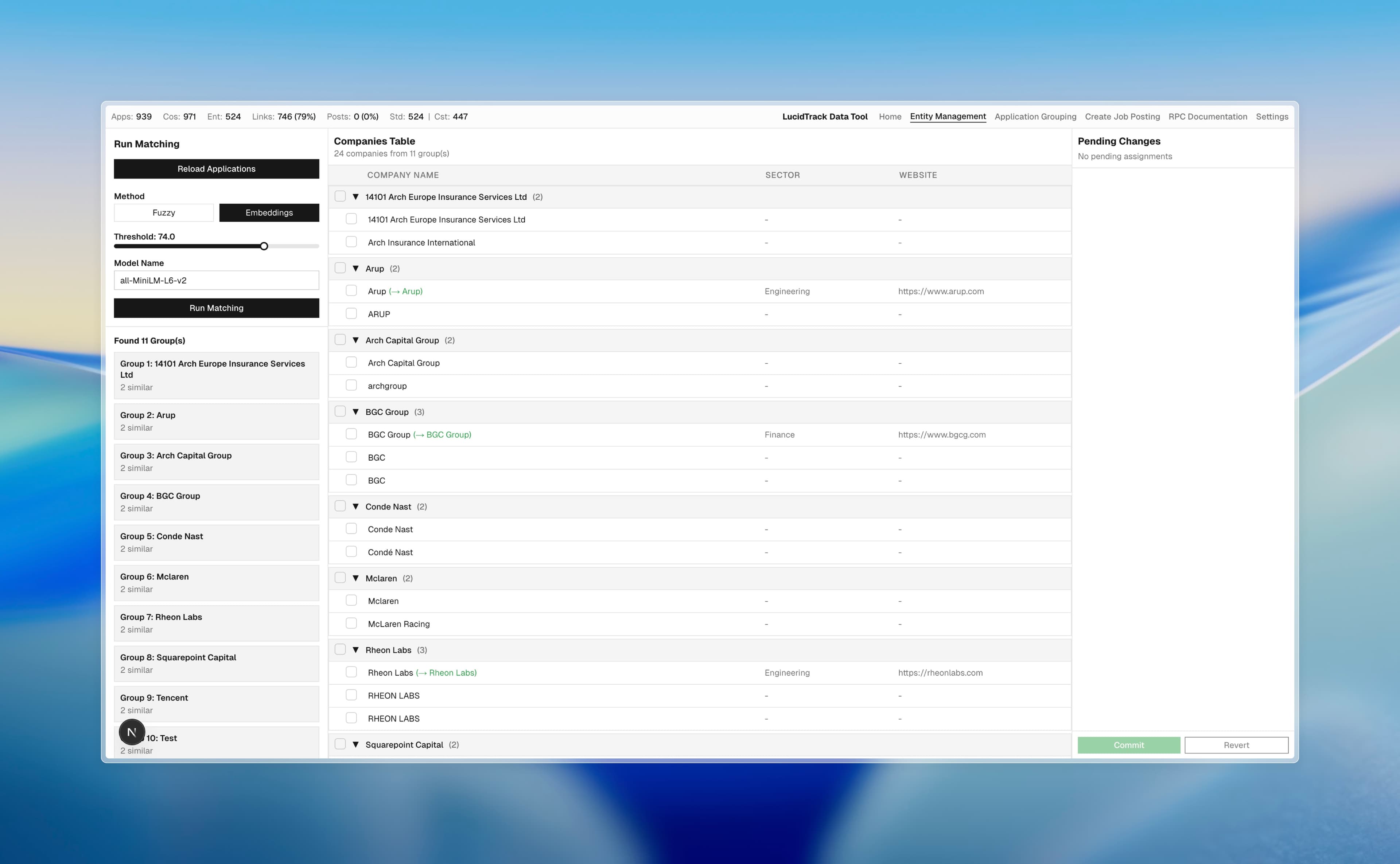 Full-stack data cleansing application for normalising and deduplicating job application records. Built FastAPI backend with dual matching algorithms: RapidFuzz-based fuzzy string matching and sentence transformer embeddings for semantic similarity. Implemented composite embeddings matcher combining company name, position, and URL features for duplicate application detection. Architected entity assignment system linking companies to canonical entities with batch processing and transaction management. Developed URL cleansing pipeline normalising application links. Built Next.js 16 frontend with React Context state management and modular tab-based UI. Integrated Supabase for database operations with RPC functions for complex queries. Designed configurable threshold-based matching with real-time preview and export functionality.