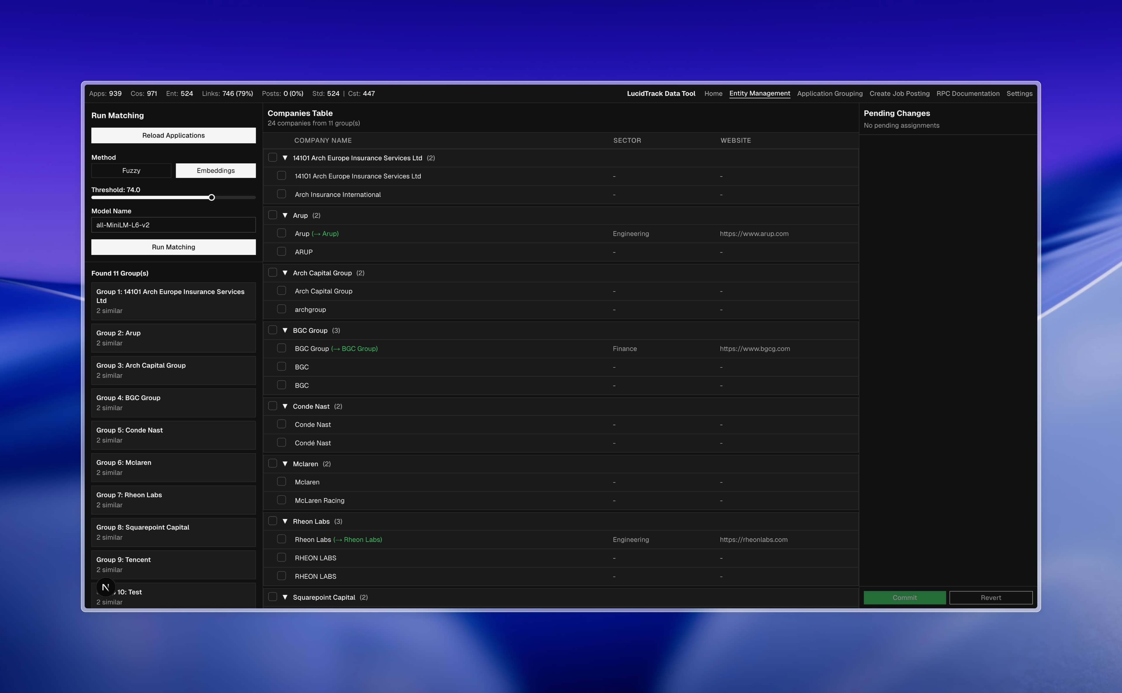 Full-stack data cleansing application for normalising and deduplicating job application records. Built FastAPI backend with dual matching algorithms: RapidFuzz-based fuzzy string matching and sentence transformer embeddings for semantic similarity. Implemented composite embeddings matcher combining company name, position, and URL features for duplicate application detection. Architected entity assignment system linking companies to canonical entities with batch processing and transaction management. Developed URL cleansing pipeline normalising application links. Built Next.js 16 frontend with React Context state management and modular tab-based UI. Integrated Supabase for database operations with RPC functions for complex queries. Designed configurable threshold-based matching with real-time preview and export functionality.